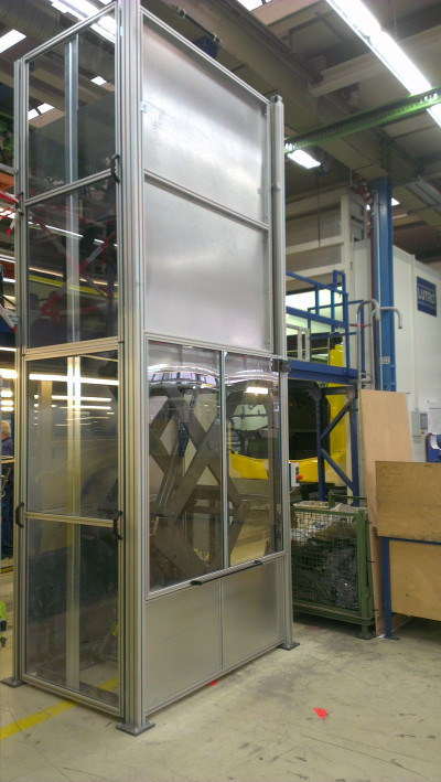 Doppelscherenkonstruktion mit Sicherheitsgeländer und elektromechanisch verriegelten Türen zur Beschickung einer zweiten Ladeebene. |