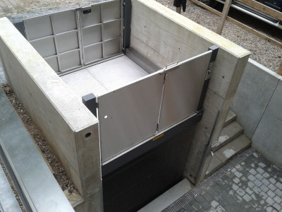 Hebebühne in einem Schacht montiert und mit verriegelter Drehtür abgesichert. |