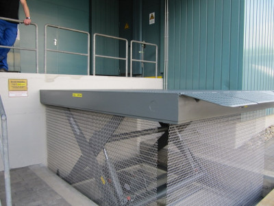 Serienhebebühne, eingesetzt zum Niveauausgleich zwischen zwei Laderampen und dem Hofnivau. |
