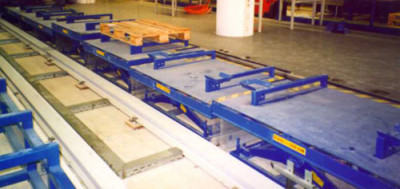 Serienhubtisch mit Kugelrollenaufbau in einer Produktionslinie. |