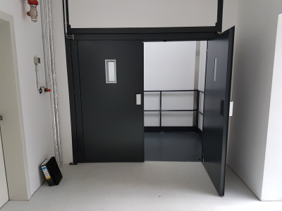 Hebebühne in einem Schacht montiert und mit verriegelter Drehtür abgesichert. |
