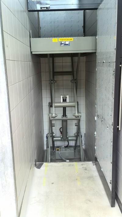Doppelscheren-Hebebühne mit elektromechanisch verriegelten Zugangstüren aus Edelstahl, feinkorn geschliffen. Eingesetzt zur Beschickung einer Großwäscherei in der Kellerebene eines Wirtschaftsgebäudes |